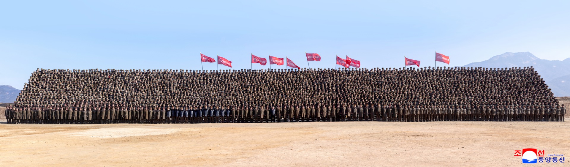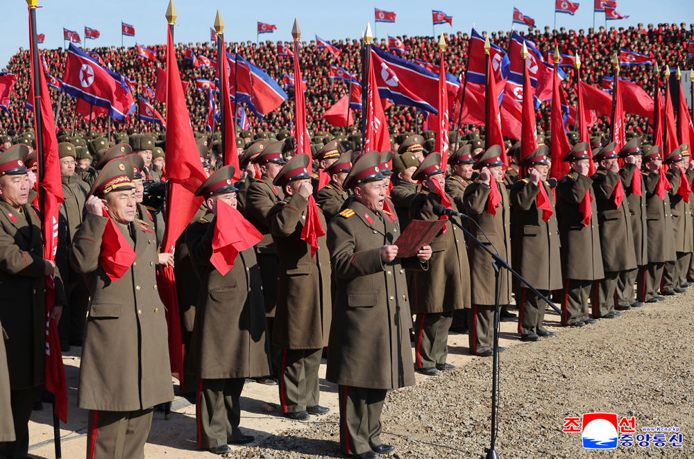 All the soldier-builders loudly shouted in chorus such slogans as "Kim Jong Un" and "Death-defying Defence", in reflection of their pledge of single-minded loyalty to add glory to their noble title - the pioneer of transformation and the creator of happiness for the country and the people - by upholding the deep trust of the Party Central Committee with their spirit of unconditional implementation and staunch practical ability.